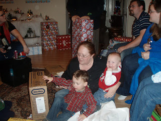 We also attended Kat and Jon's annual Caroling party. Had a blast. Shane stayed home because he was feeling icky, so the boys had me running in circles, but Aunty KaKa and Uncle Jon and several party guests helped me out.